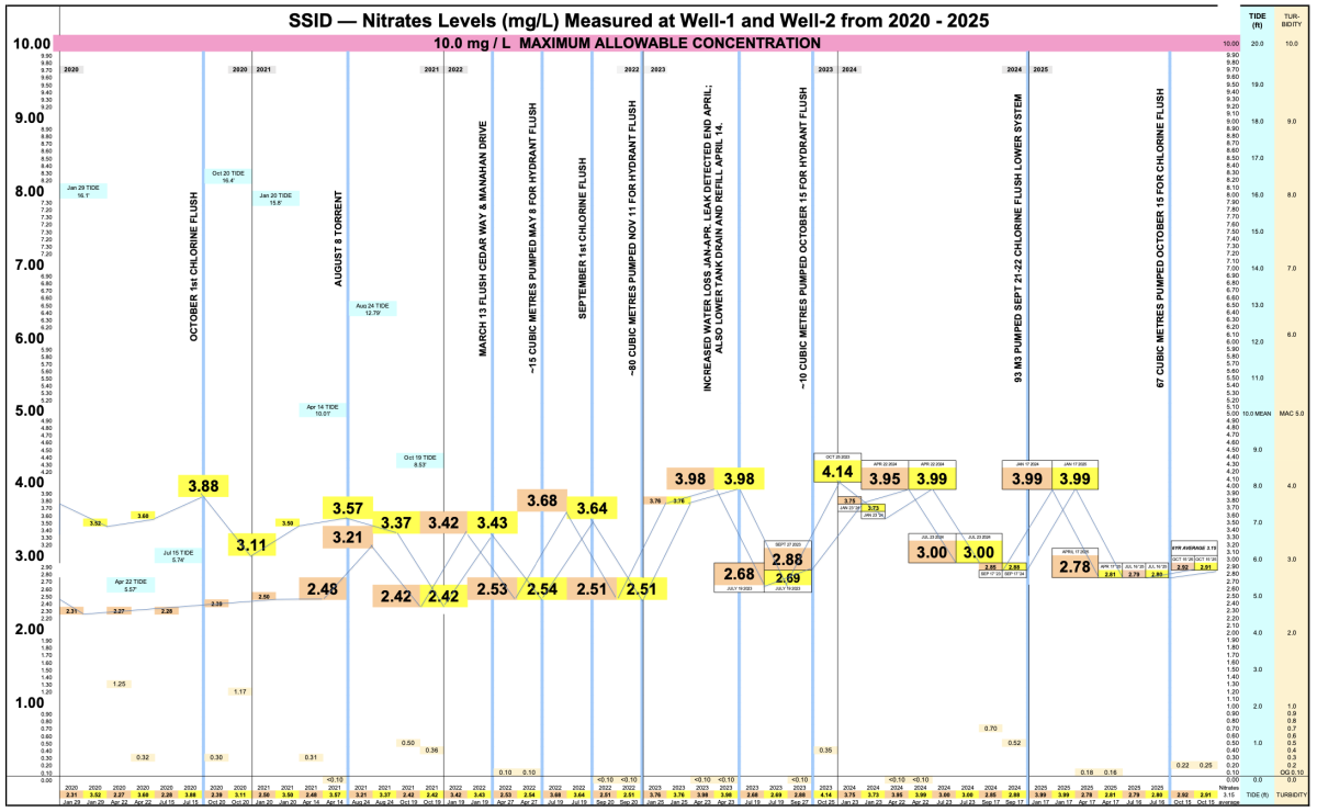 Images and files on this page demonstrate nitrates levels in Savary Shores since 1989. The October 2025 nitrates levels of 2.91mg/100mL at well-1 and 2.92mg/100mL at well-2 are safely within Canadian Drinking Water Guidelines. Water from both wells combine in the water tanks, so the amount of nitrates consumed at the tap will be an approximate average of the two wells.