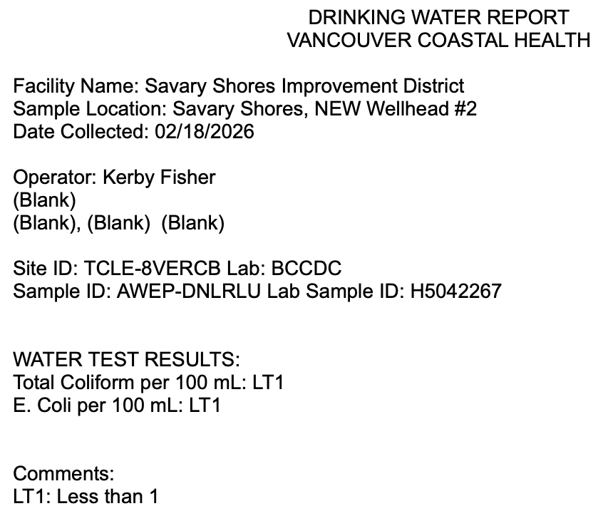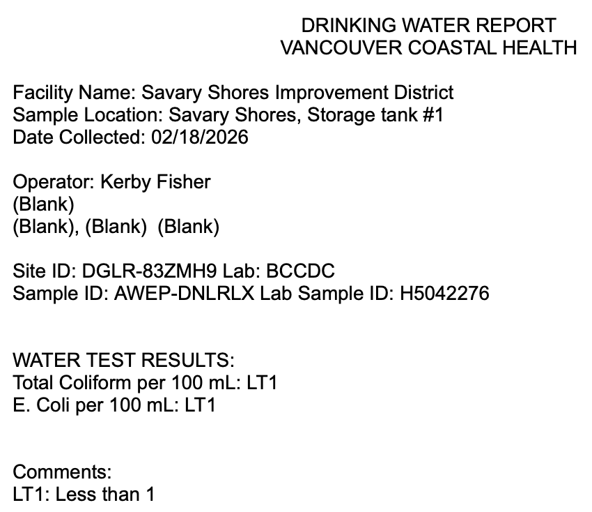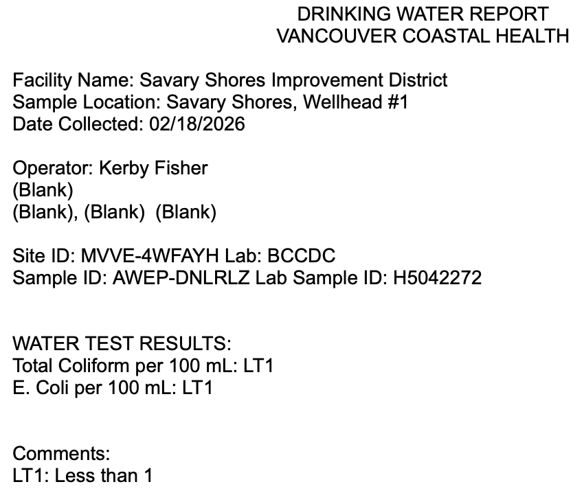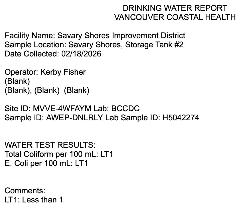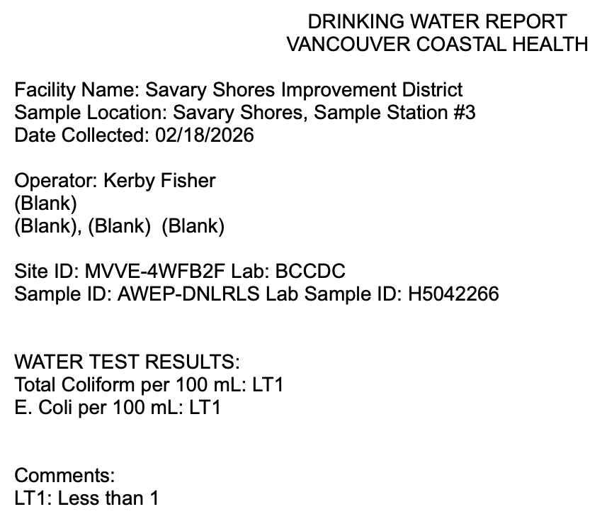 Water samples taken at 8 locations in SSID on February 18 2026 all show LT1 (less than 1) counts of coliforms and E.coli.