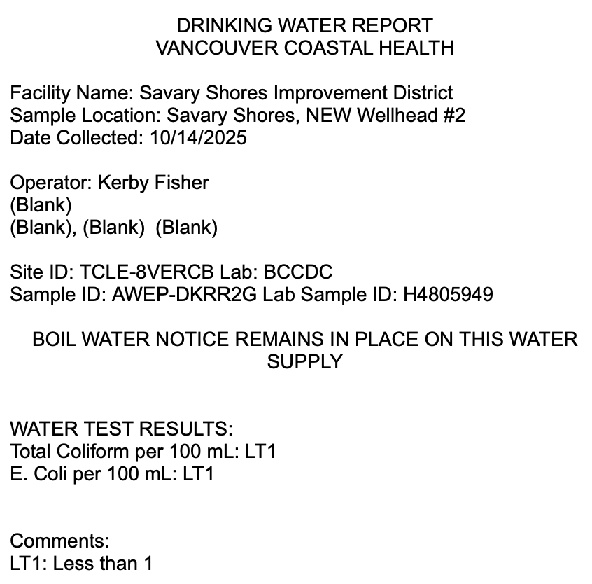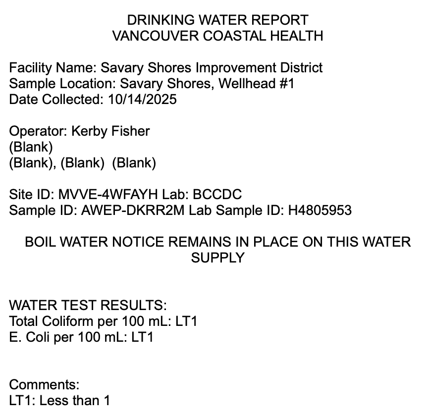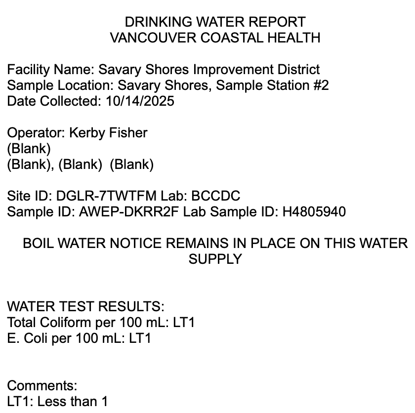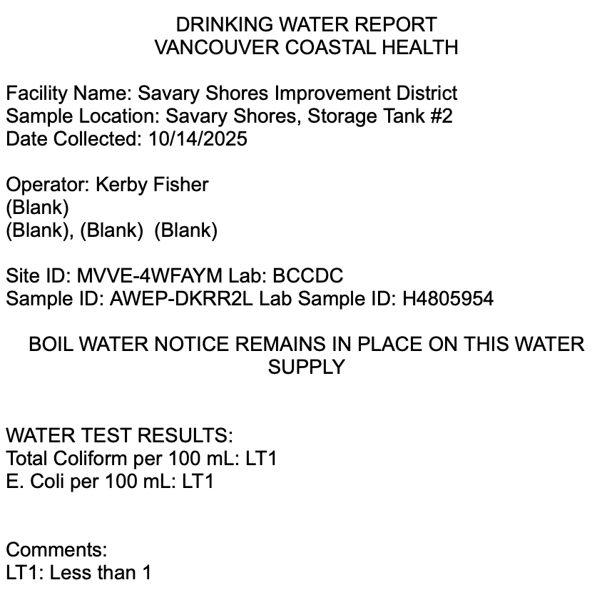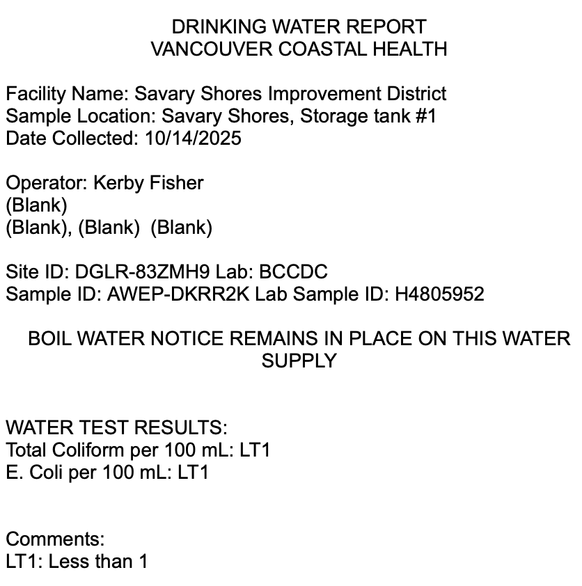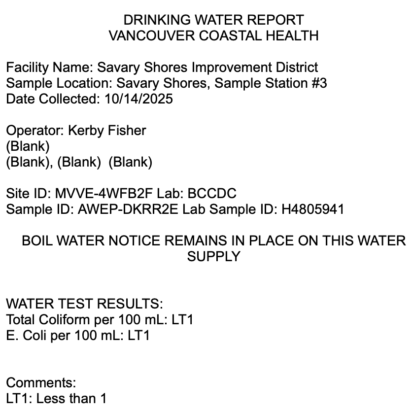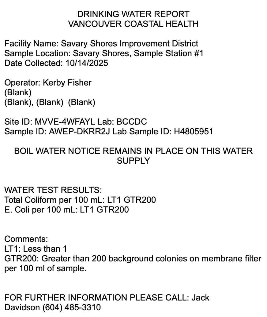 The water in Savary Shores is now safe to drink. All 8 sample stations now show LT1 (less than 1) counts of coliforms and E.coli, so the Drinking Water Officer has lifted the Boil Water Advisory. (The note on these reports below indicate that the boil water was in effect, but that has been lifted since the reports came in.)