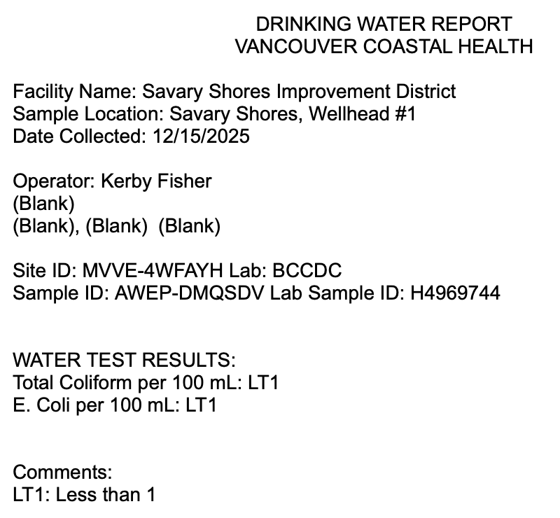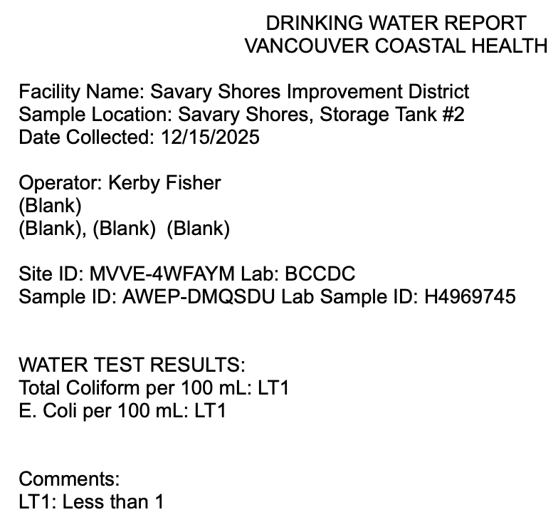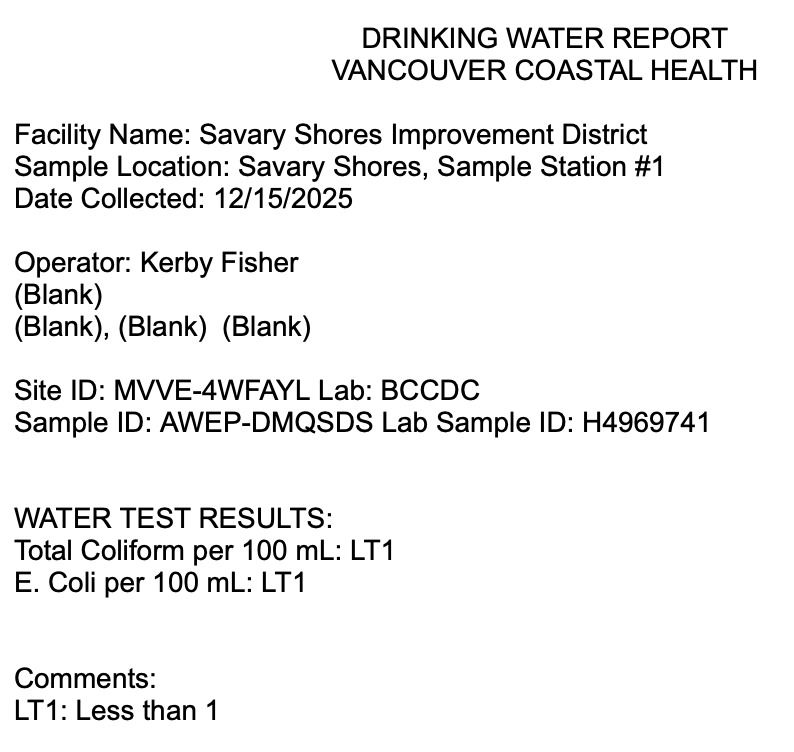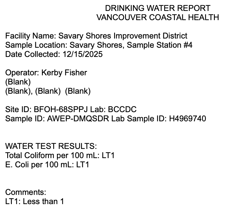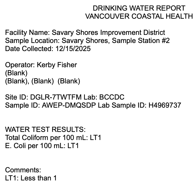 Water samples taken at 8 locations in SSID on December 15 2025 all show LT1 (less than 1) counts of coliforms and E.coli.